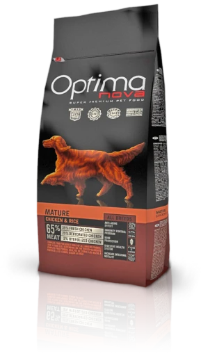 Optimanova Adult Mature Chicken & Rice está especialmente formulado para fortalecer el sistema inmunológico y la articulaciones de los perros en edad madura o avanzada. Contiene antioxidantes naturales (tocoferoles) que protegen su organismo de los radicales libres. Calcio, fósforo y vitamina D para fortalecer sus huesos y músculos. Evita problemas de artrosis manteniendo el tejido cartilaginoso sano, gracias a la condroitina y la glucosamina. Y además favorece un tracto intestinal saludable por su óptimo contenido en fibras.