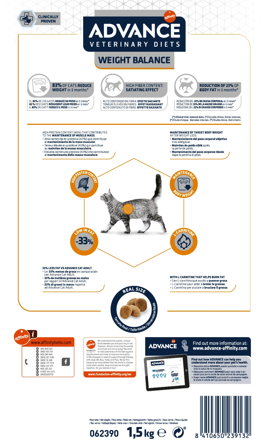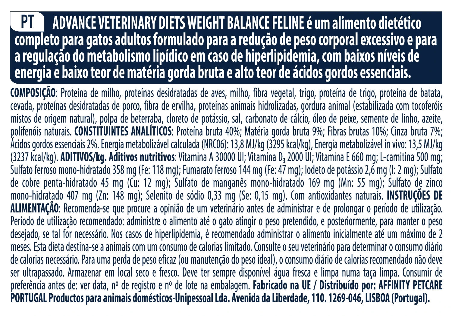 ADVANCE VETERINARY DIETS WEIGHT BALANCE FELINE es un alimento dietético completo para gatos adultos, formulado para reducir el exceso de peso y regular el metabolismo lipídico en caso de hiperlipidemia, con niveles bajos de energía, bajo contenido de grasa y elevado contenido de ácidos grasos esenciales. Los resultados de ADVANCE VETERINARY DIETS WEIGHT BALANCE FELINE están clínicamente probados, el 83% de los gatos reducen su peso en 3 meses*. (*Estudio clínico. Datos internos.)