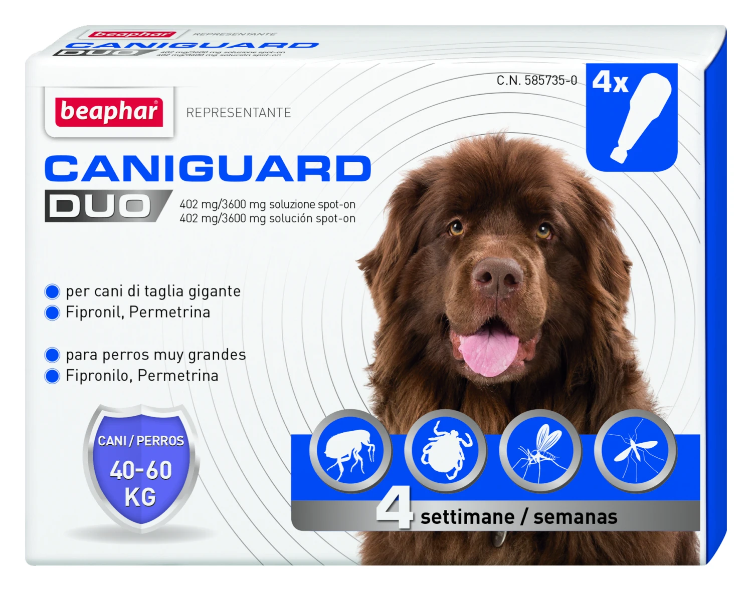 Las pipetas para perros antiparasitiarias Caniguard Duo son el nuevo repelente externo de amplio espectro de los prestigiosos laboratorios Beaphar que ofrecen la máxima protección al perro contra los 4 ectoparásitos más comunes durante 4 semanas: