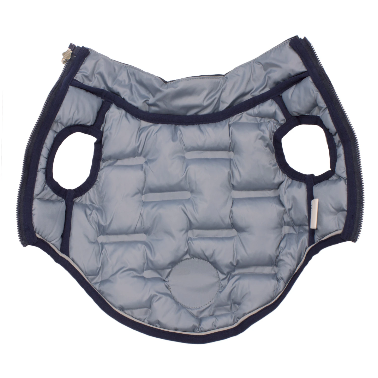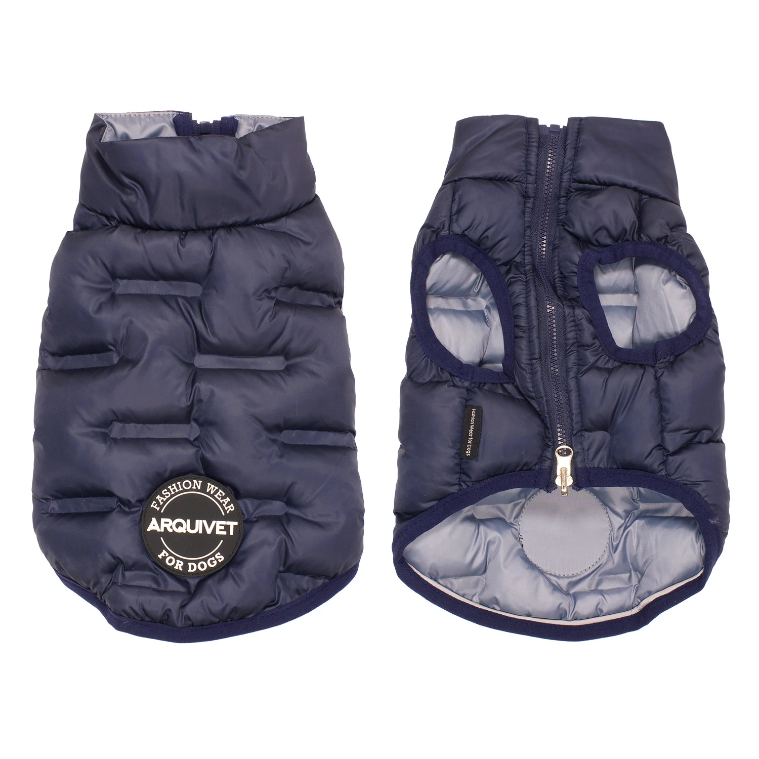 Chaleco acolchado reversible, colores Dos Azules. Orificios para patas delanteras. Apertura inferior mediante cremallera. Fácil de poner y quitar.