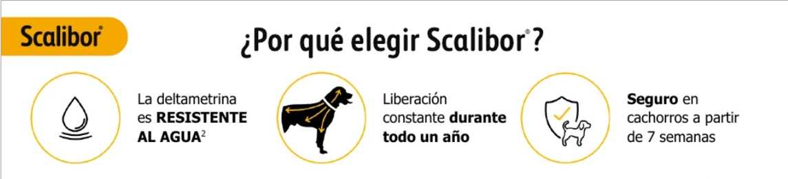 Collar antiparasitario para perros de raza grande, eficaz contra pulgas, garrapatas y flebotomos. Adecuado para prevenir la enfermedad de la leishmaniosis canina. Fácil de usar: sólo deberás cortar el trozo sobrante ¡y listo! Scalibor garantiza protección para la mascota y tranquilidad para el dueño. Medidas: 65 cm.