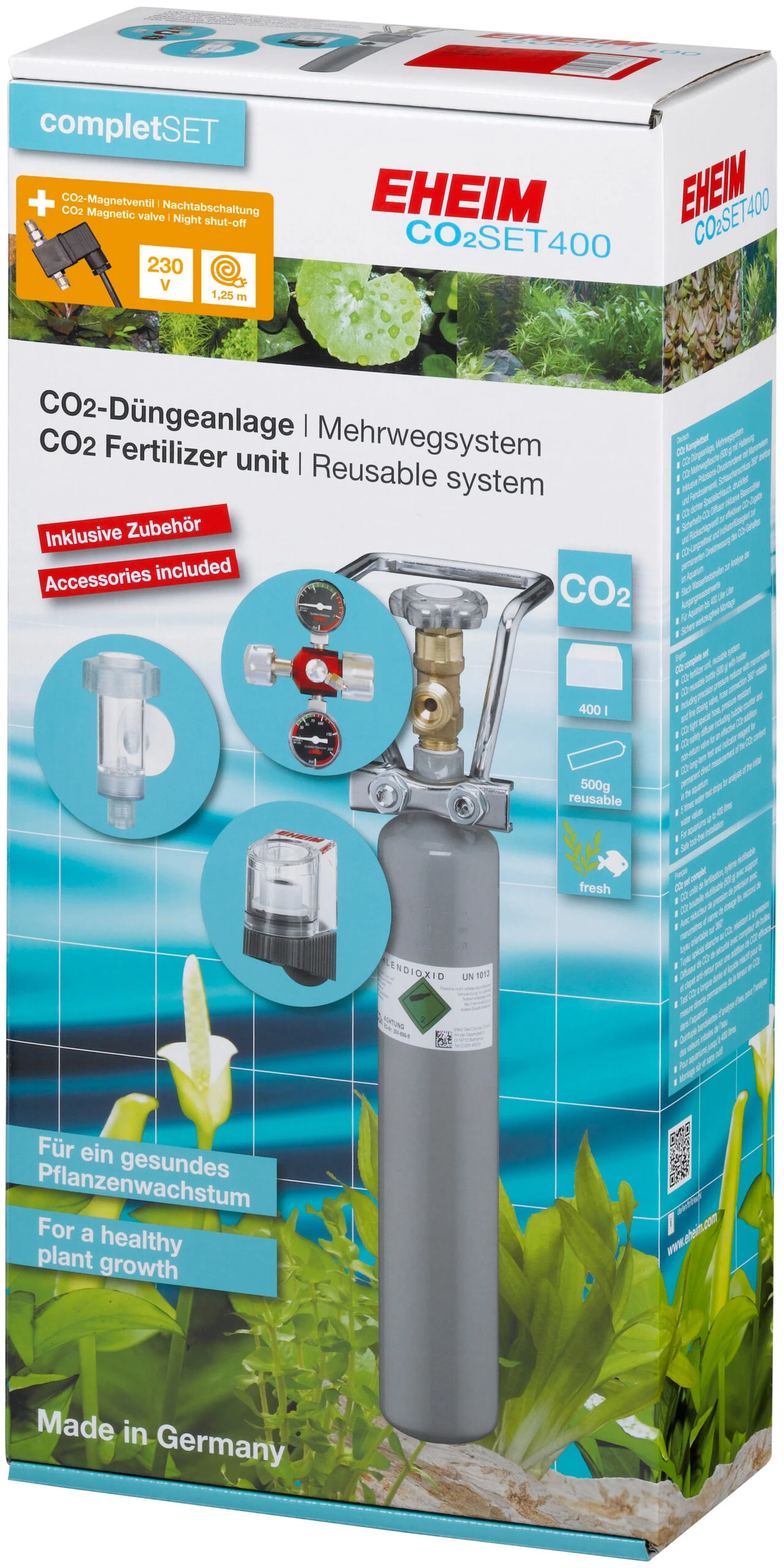 Con una selección de tres juegos completos, EHEIM ofrece el sistema de CO2 ideal para su acuario: un sistema desechable con una botella desechable reciclable para acuarios de hasta 200 litros y dos sistemas reutilizables con botellas recargables para acuarios de hasta 400 y 600 litros. ‘Juego completo’ significa que se incluyen todos los equipos esenciales y accesorios importantes, listos para una configuración inmediata.