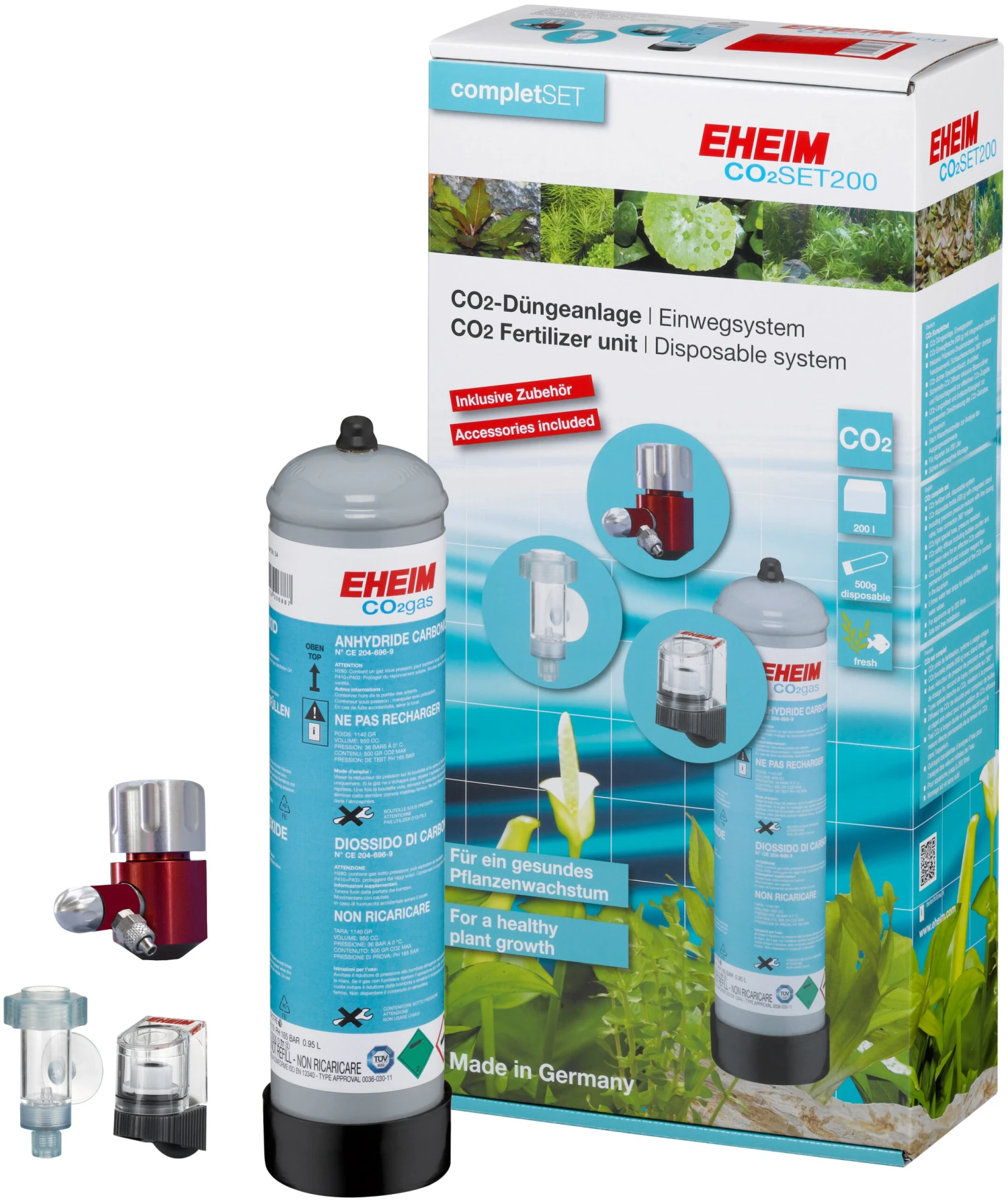 Con una selección de tres juegos completos, EHEIM ofrece el sistema de CO2 ideal para adaptarse a su acuario: un sistema desechable con una botella desechable reciclable para acuarios de hasta 200 litros y dos sistemas reutilizables con botellas recargables para acuarios de hasta 400 y 600 litros. ‘Juego completo’ significa que se incluyen todos los equipos esenciales y accesorios importantes, listos para una configuración inmediata.