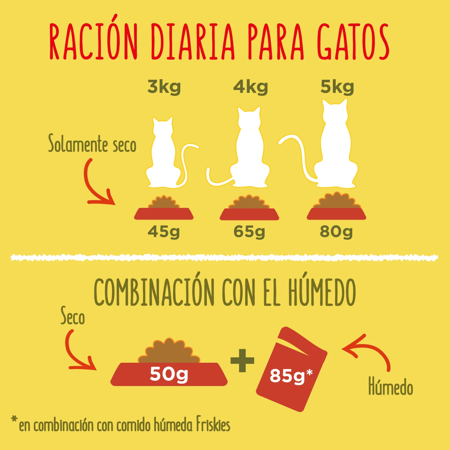 La personalidad única de tu gato brinda algo muy especial a tu hogar, aportando alegría a vuestras vidas. Es una alimentación 100% completa y equilibrada que incluye proteínas de alta calidad, ácidos grasos, vitaminas y minerales que contribuyen en una vida saludable, la vitalidad y la felicidad de tu gato. Las raciones medias recomendadas para el mantenimiento de gatos adultos están basadas en gatos con una actividad moderada y sometidos a condiciones ambientales normales. Las necesidades individuales varían y las raciones deberían deben ser ajustadas adecuadamente para mantener a tu gato esbelto en un peso corporal saludable.