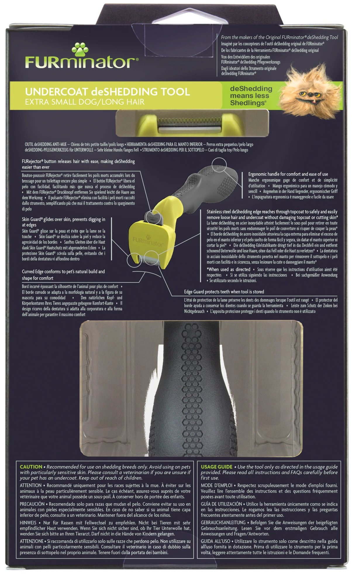 «FURminator® Undercoat deShedding Tool para perros extra pequeños de pelo largo elimina el 99 % del pelo suelto procedente de la muda. Úselo 1 o 2 veces a la semana en sesiones de 10 a 20 minutos sobre el pelo seco.