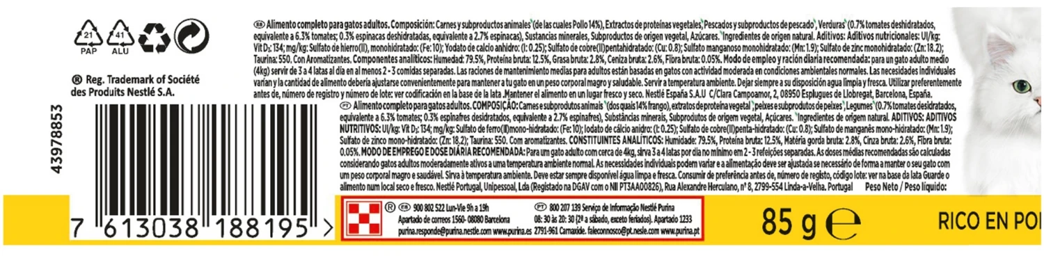 Composicion: Carnes y subproductos animales* (de los cuales Pollo 14%), Extractos de proteinas vegetales*, Pescado y subproductos de pescado*, Verduras* (0,7% tomates deshidratados, equivalente a 6,3% tomates; 0,3% espinacas deshidratadas, equivalente a 2,7% espinacas), Substancias minerales, Subproductos de orginen vegetal, Azúcares. *Ingredientes de origen natural.