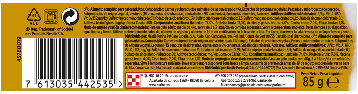 Composición: Carnes y subproductos animales (de las cuales pollo 4%), Extractos de proteínas vegetales, Pescados y subproductos de pescado, Subproductos de origen vegetal, Verduras (1% zanahorias deshidratadas, equivalente a 9% zanahorias), Sustancias minerales, Azúcares.