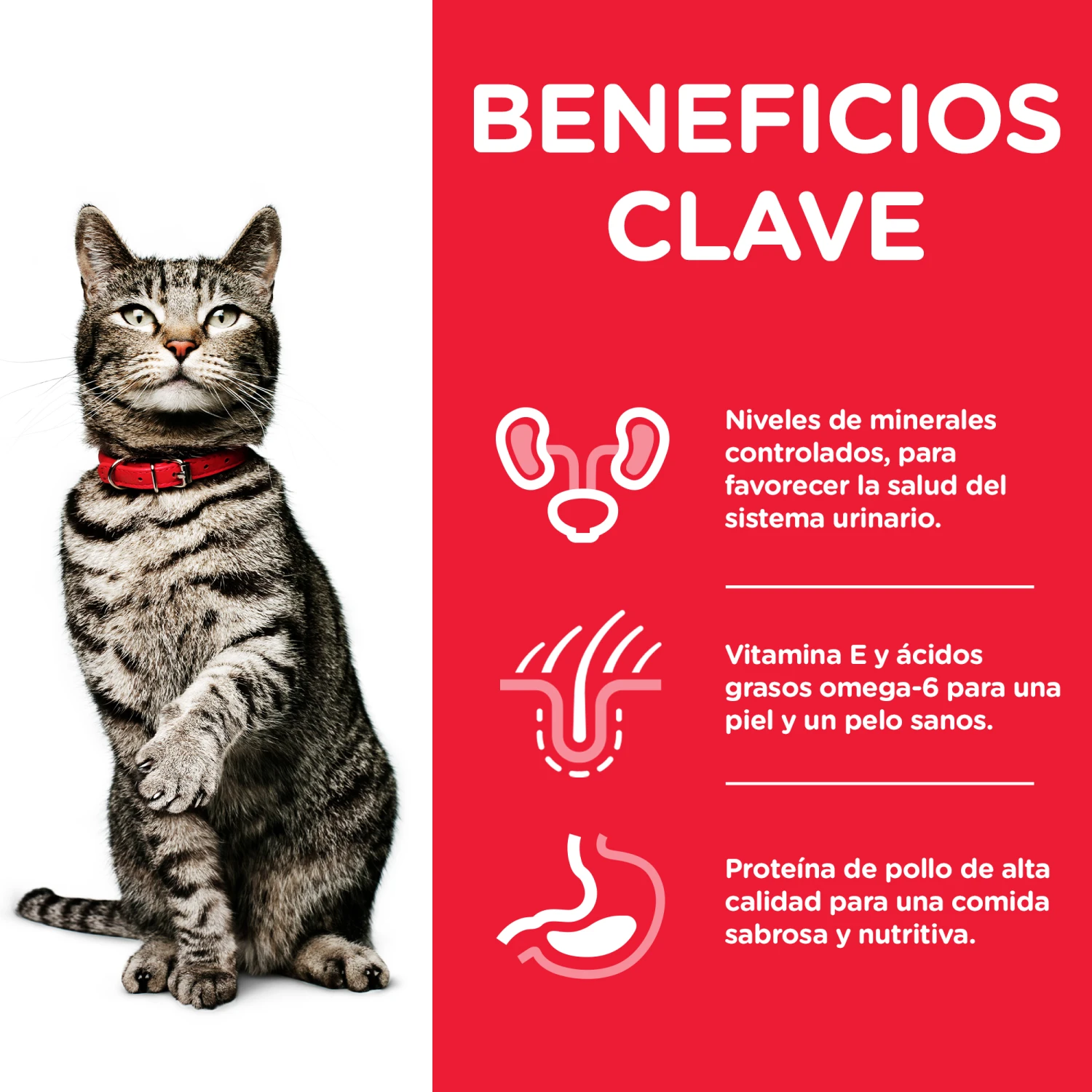 Pienso para gatos adultos esterilizados que controla la salud urinaria integral además del peso. Favorece el sistema urinario ayudando a mantener un pH adecuado, con una receta deliciosa que les encanta. Con pollo.