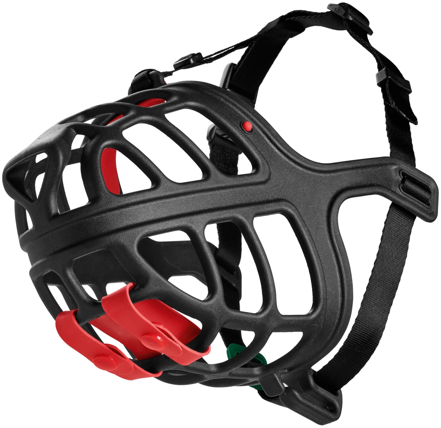 Este bozal representa una verdadera innovación en varios frentes, con la comodidad y el bienestar del perro como principales prioridades. La boca está hecha de una sola pieza de plástico y el uso de un elastómero termoplástico (TPE) asegura que sea particularmente flexible sin perder su durabilidad. Acolchado alrededor de la nariz y la frente para un ajuste ceñido y cómodo en estas partes sensibles de la cara. La rejilla con grandes espacios permite al perro jadear y beber agua, incluso las golosinas pequeñas pueden pasar fácilmente. El hocico protector extraíble es una característica particularmente especial, ya que puede salvar la vida de un perro al evitar que recoja cebos venenosos. Las correas de nailon infinitamente ajustables garantizan que el hocico se mantenga firmemente sujeto y el perro no pueda quitarlo, aunque no restringirá el movimiento del animal. El gancho integrado permite sujetar la boca directamente al cuello.