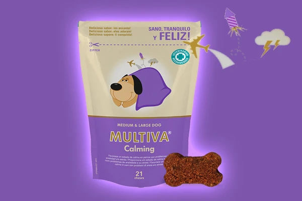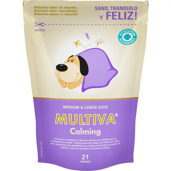 Suplemento nutricional que actúa como calmante natural en perros con problemas estrés y/o ansiedad. Multiva Calming ayuda a controlar conductas no deseadas como hiperactividad, ladridos, marcaje con orina u otras. Para uso puntual o habitual. Presentación especial para perros medianos y grandes. Formato: 21 chews (comprimidos masticables).