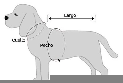 Elige la talla más adecuada para tu mascota: Toma medidas del largo de la espalda, desde el cuello hasta la base de la cola. A continuación, mide el perímetro del cuello y el pecho de tu mascota. En caso de dudar entre 2 tallas, elige siempre la talla superior (Ver imagen).