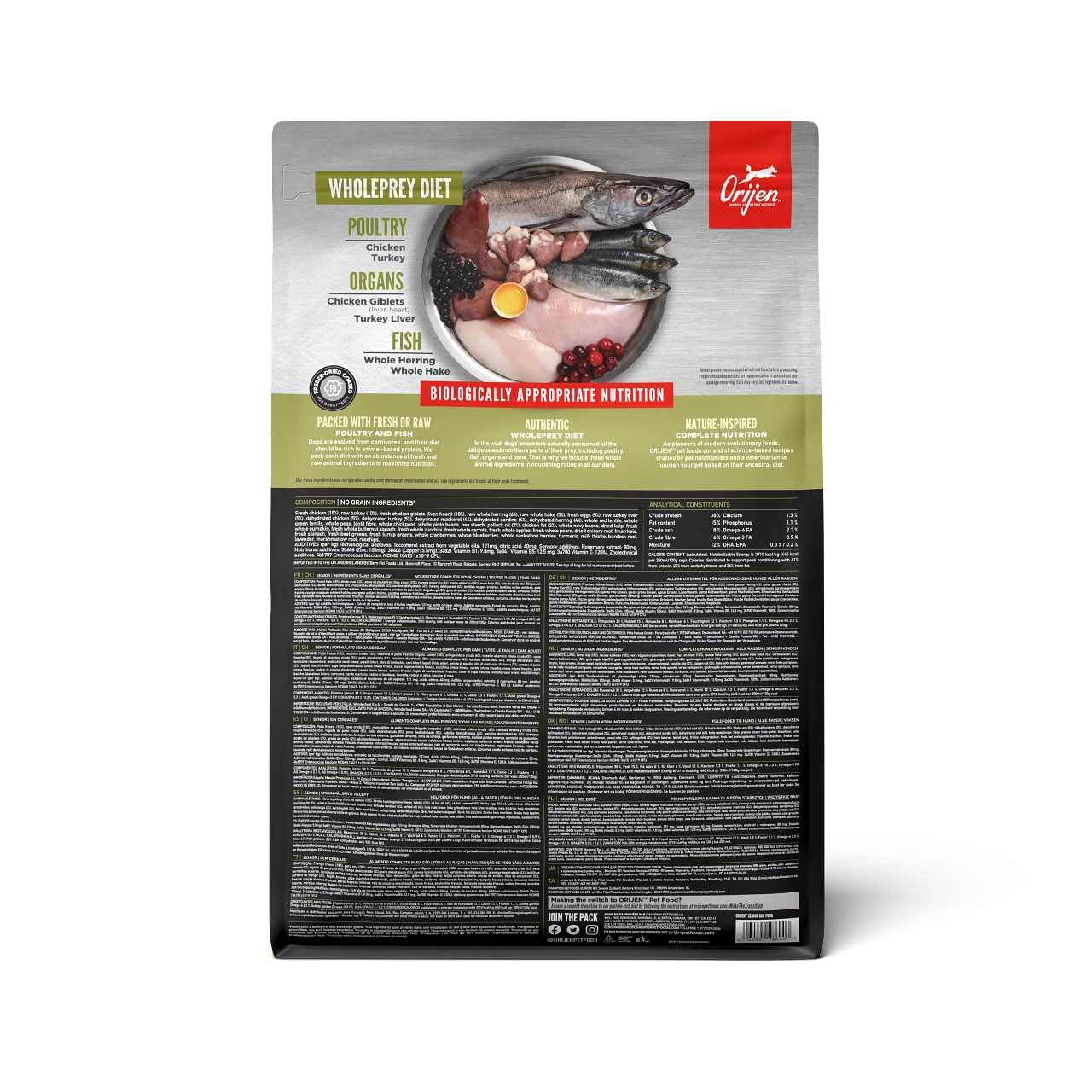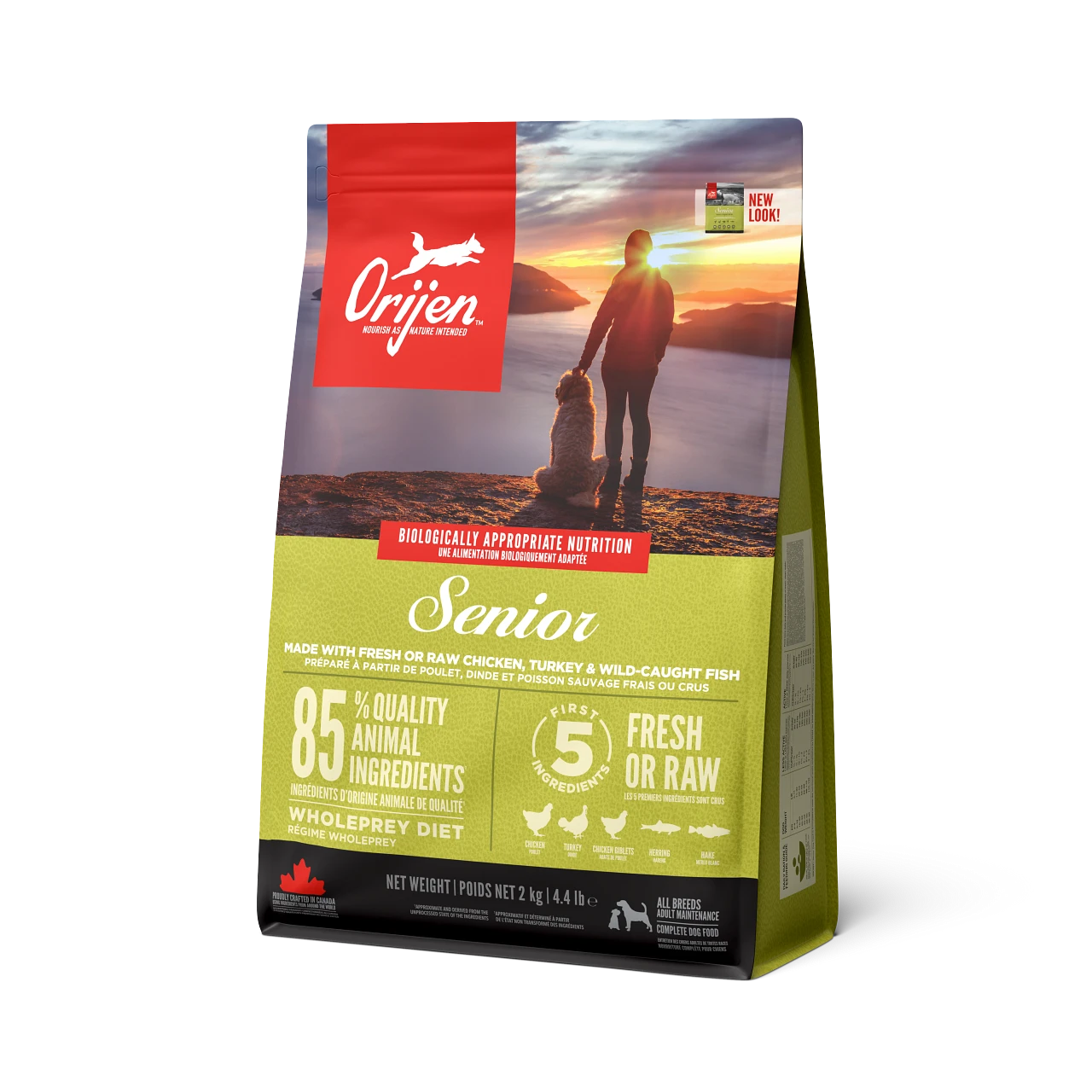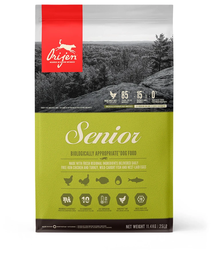2/3 de nuestros ingredientes animales son frescos o crudos y 1/3 están deshidratados para proporcionar una fuente concentrada de proteínas. Con carne, órganos, cartílagos y huesos de pollo y pavo frescos criados en libertad, pescado salvaje y huevos frescos de corral, Orijen Senior ofrece a estos perros mayores todos los nutrientes y vitaminas que necesitan en esta etapa de la vida.