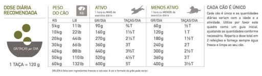 La energía metabolizable es de 3.630 kcal/kg (435 kcal por taza de 250 ml/120 g), con calorías distribuidas para favorecer el acondicionamiento máximo: 38% de proteínas, 21% de verduras y frutas y 37% de grasas.