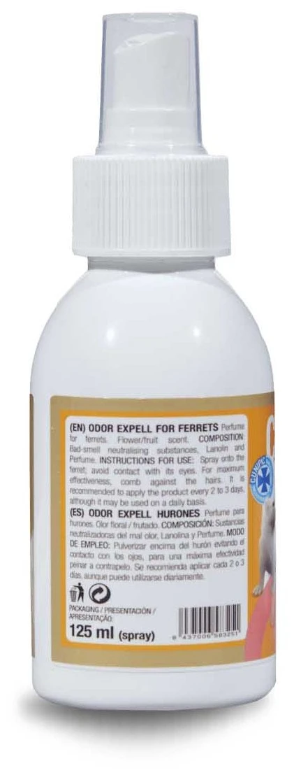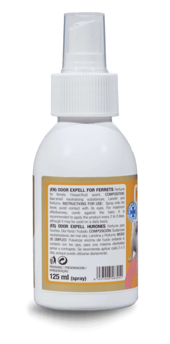 Perfume especial para hurones con aroma floral/afrutado adecuado para acabar con el olor desagradable del hurón. Envase de 125 ml con pulverizador.