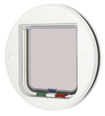 Puerta Gatera Cat Mate con atractivo diseño circular especialmente indicada para instalar en cristales. La puerta redonda para gatos ofrece 4 posiciones de bloqueo y es idónea para superficies de cristal. Apta para paneles hasta 30 mm. Color: Blanco.
