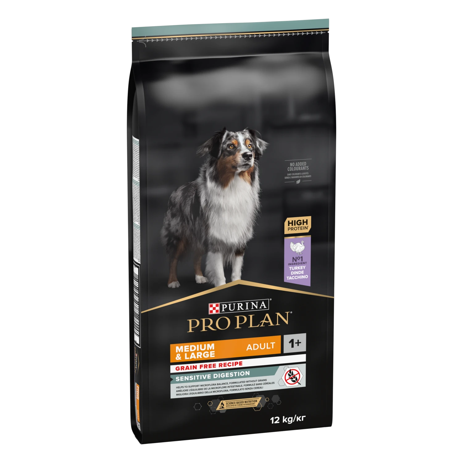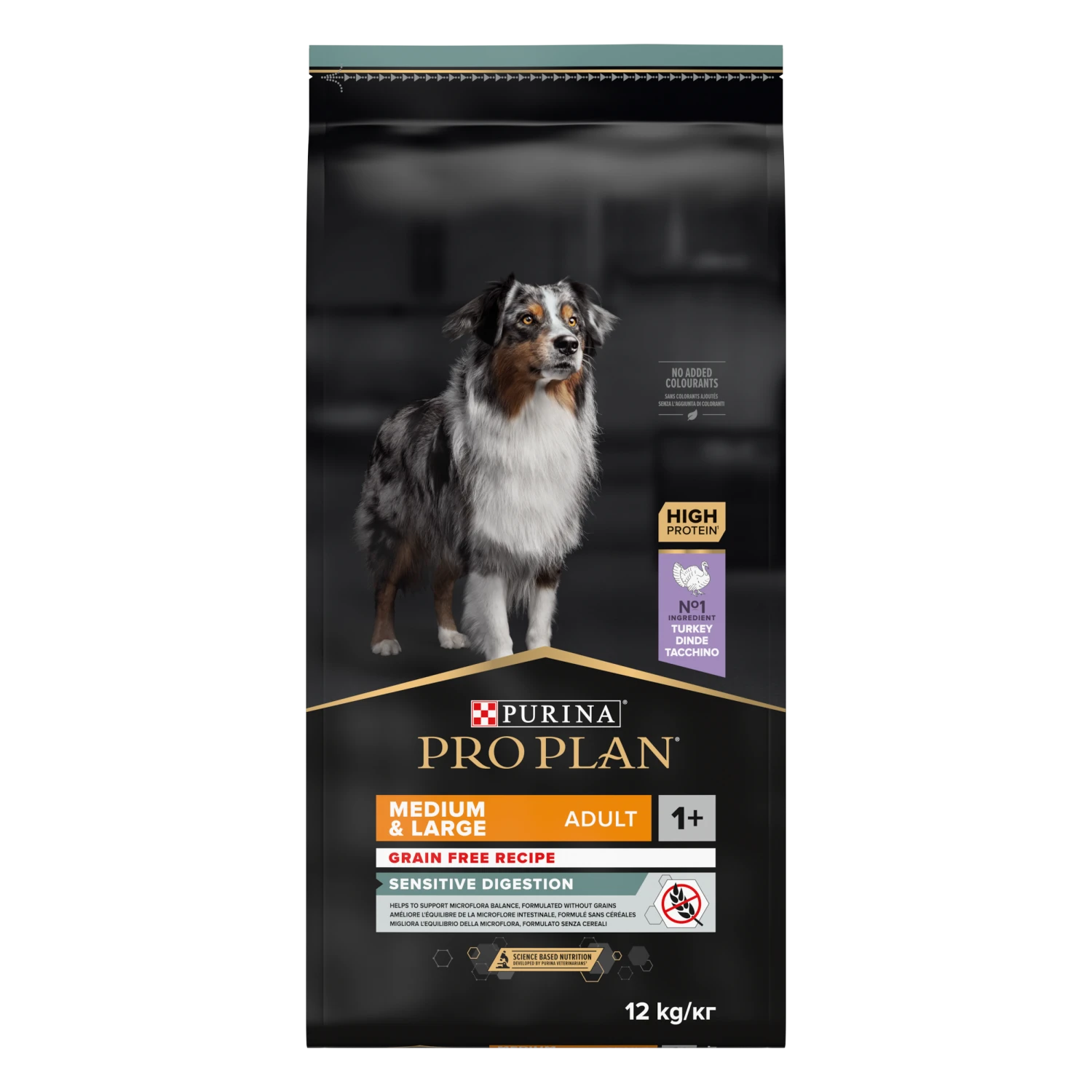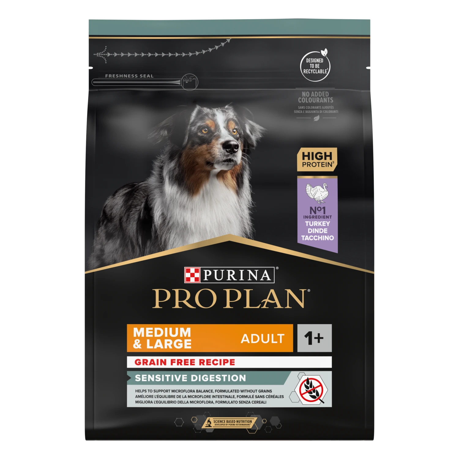 PURINA® PRO PLAN® Grain Free Formula Medium & Large Adult Sensitive Digestion Rico en Pavo con n OPTIDIGEST® es un alimento seco completo para perros de razas pequeñas y miniatura con una digestión sensible.