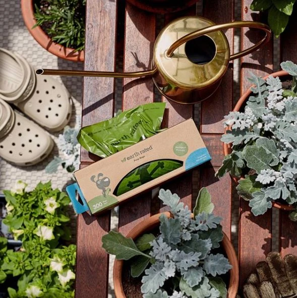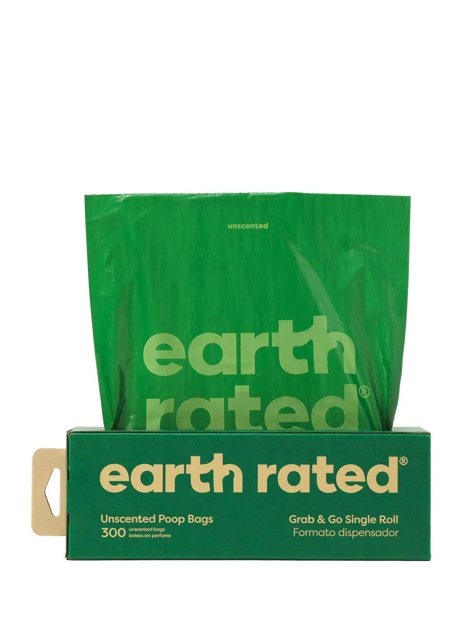 Rollo de 300 bolsas higiénicas biodegradables sin perfume. Estas bolsas Earth Rated vienen en una caja de cartón con una ranura para sacarlas fácilmente. También es ideal para guardar en trasteros, despensas o contenedores de desechos. Compatible con los dispensadores habituales en parques públicos.