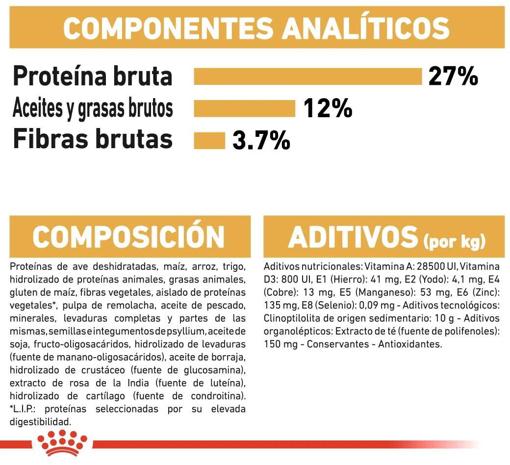 Componentes Analíticos: Proteína bruta: 27% – Aceites y grasas brutos: 12% – Ceniza bruta: 6,1% – Fibras brutas: 3,7% – Ácidos grasos EPA y DHA: 3 g/kg.*L.I.P.: proteína seleccionada por su elevada asimilación.