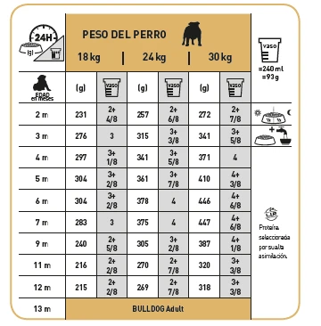Especialmente formulado para bulldog Inglés cachorro. Su croqueta es especial para adaptarse a su mandíbula braquicéfala, y facilita la digestión del cachorro. Refuerza las defensas naturales del cachorro.