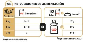 ¿Qué beneficios aporta Royal Canin Chihuahua? Pelo: contiene nutrientes para la salud del pelo y la piel Textura adaptada: altamente palatable (tipo paté) Tránsito intestinal: ayuda a mantener una buena salud del tránsito Estimulación del apetito: satisface apetitos exigentes