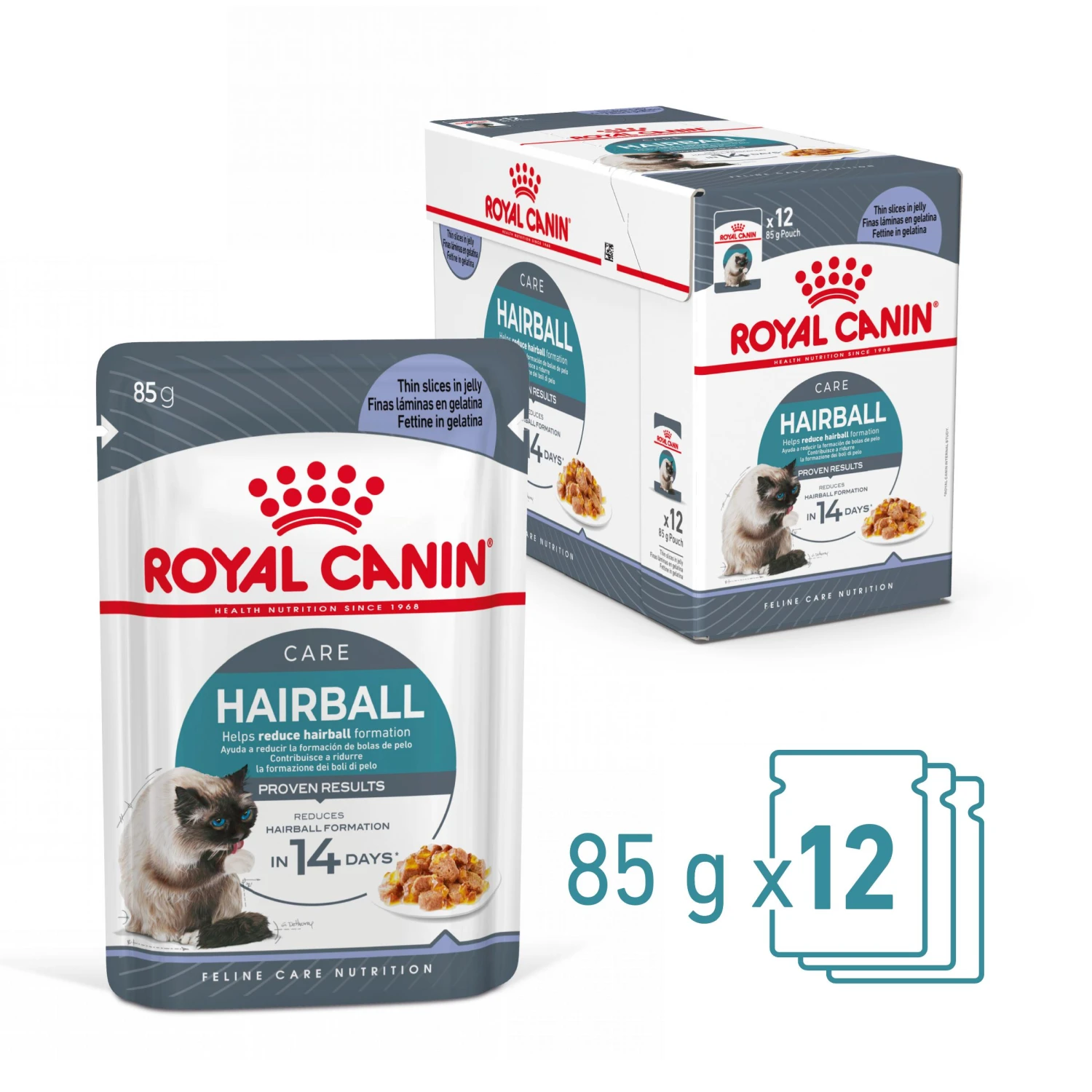Hairball Care en salsa de ROYAL CANIN® está formulado para ayudar a tu gato A estimular de manera natural el tránsito intestinal y ayudar a eliminar el exceso de pelo ingerido que, de otro modo, se acumularía en el estómago.