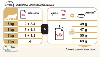 Para adaptarse a las preferencias de cada gato, Maine Coon Adult en salsa de ROYAL CANIN® también está disponible en formato seco de palatables croquetas. Si deseas proporcionar a tu gato una alimentación mixta, sigue nuestras pautas de alimentación para garantizar que recibe la cantidad precisa de ambos alimentos y así aprovechar todos sus beneficios.