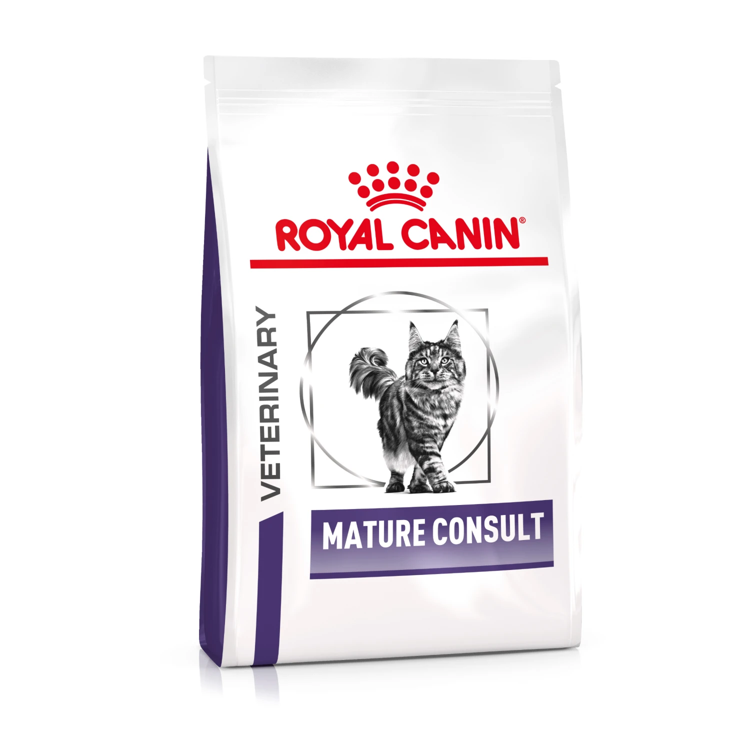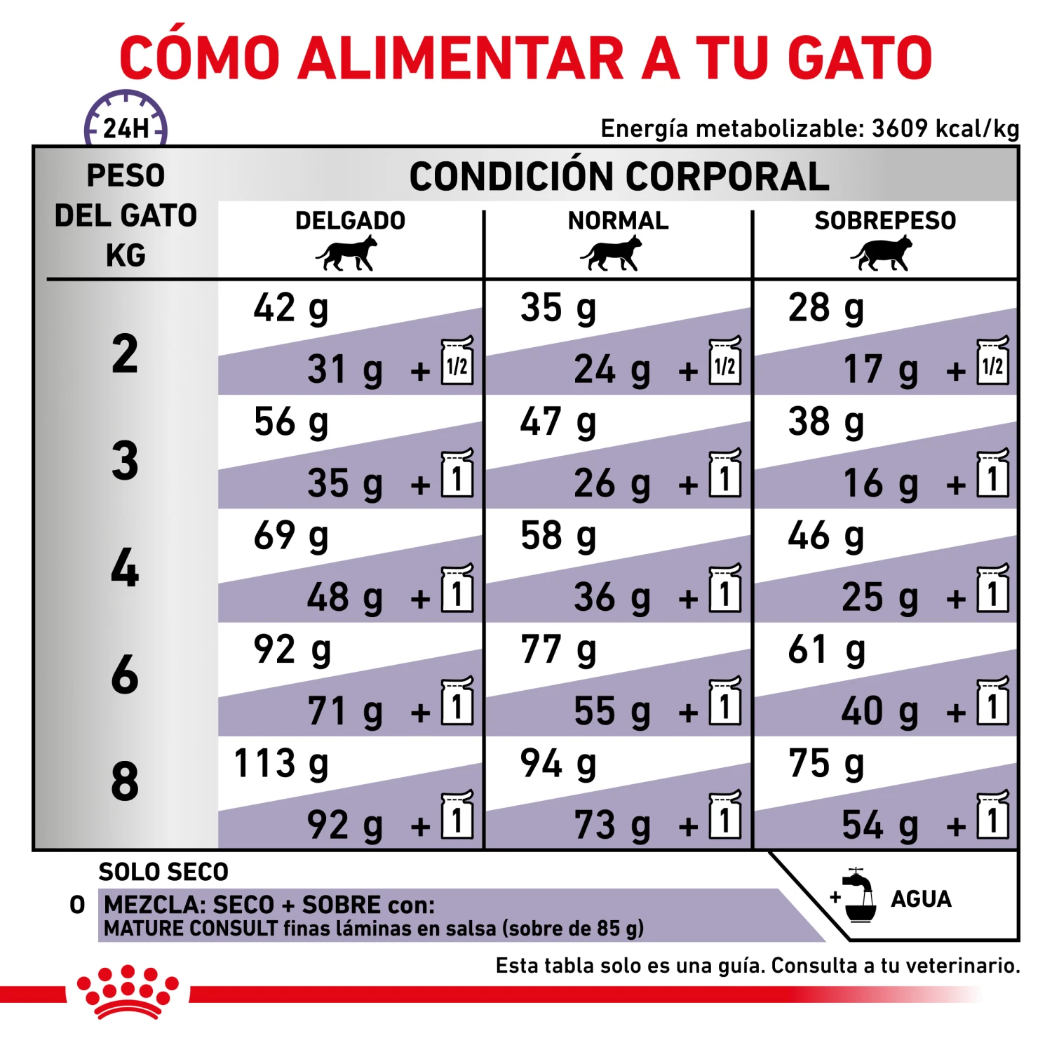 Es importante ofrecer la cantidad diaria correcta, particularmente si la alimentación es mixta. Opciones de alimentación mixta: Para satisfacer las preferencias individuales de cada gato, ROYAL CANIN® Mature Consult también está disponible en alimento húmedo con finas láminas en salsa.* La alimentación mixta proporciona a tu gato una variedad de texturas, que ayudan a estimular su apetito. El alimento húmedo ofrece un aroma más intenso y su contenido de humedad ayuda a mantener hidratada a tu mascota, mientras que el alimento seco es más cómodo de tomar y favorece más la salud dental.