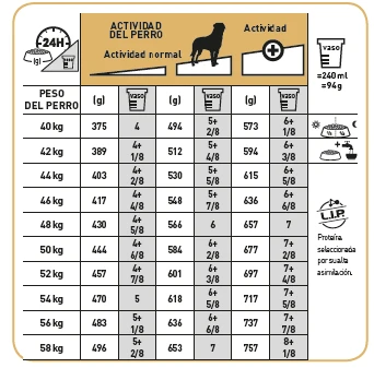 Pienso específico para esta raza, que asegura un gran dinamismo muscular: Alto contenido proteico, componente esencial en los músculos, así como de L-carnitina.- Mantenimiento articular: Alto contenido de condroitina y glucosamina, y de EPA y DHA, para ayudar a mantener la movilidad. Estimulación de la masticación: La croqueta está exclusivamente adaptada a la mandíbula molosoide del Rottweiler, para fomentar la masticación. Las siglas “L.I.P.” se refieren a la selección de proteínas atendiendo a su alta asimilación, con una digestibilidad superior al 90%. L.I.P. es por tanto una garantía de muy alta digestibilidad y de buena salud del colon.