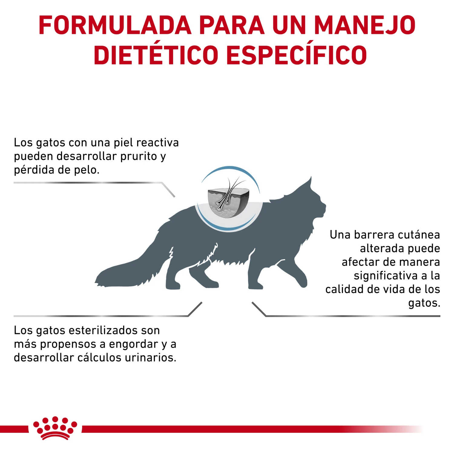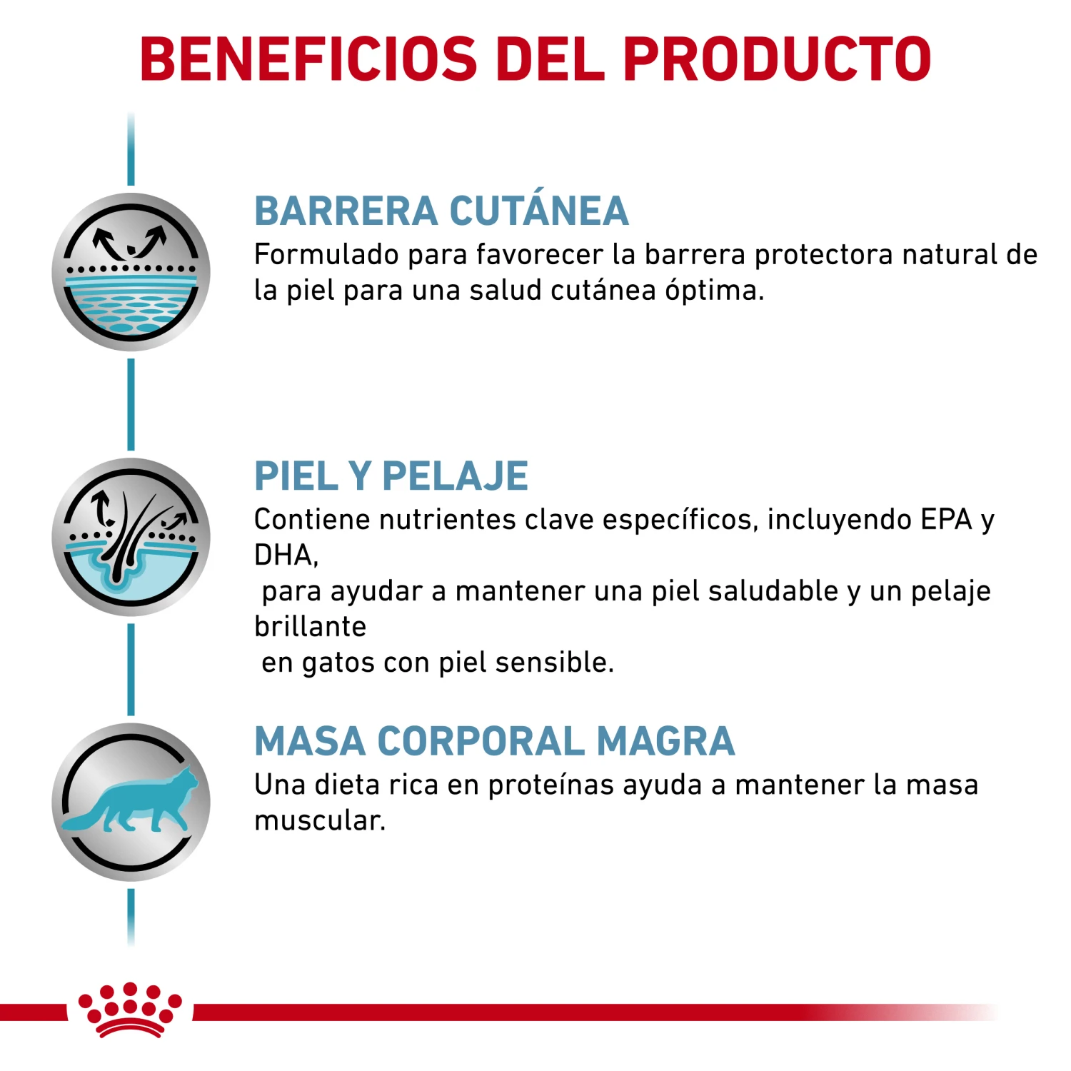 Barrera cutánea Formulado para favorecer la barrera protectora natural de la piel para una salud cutánea óptima. Piel y pelaje Contiene nutrientes clave específicos, incluyendo EPA y DHA, para ayudar a mantener una piel saludable y un pelaje brillante en gatos con piel sensible. Masa muscular Un alimento alto en proteínas ayuda a mantener la masa muscular.