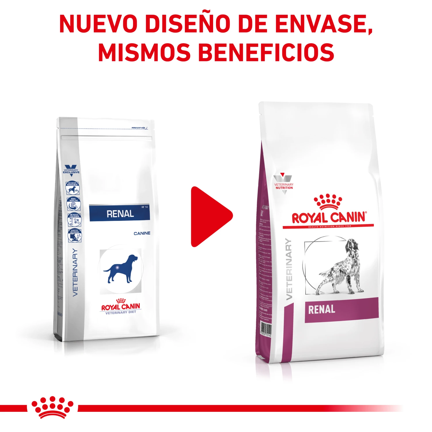 Royal Canin Canine Renal disponible en los formatos de 2 kg, 7 kg, 14 kg y pack de 14 kg.