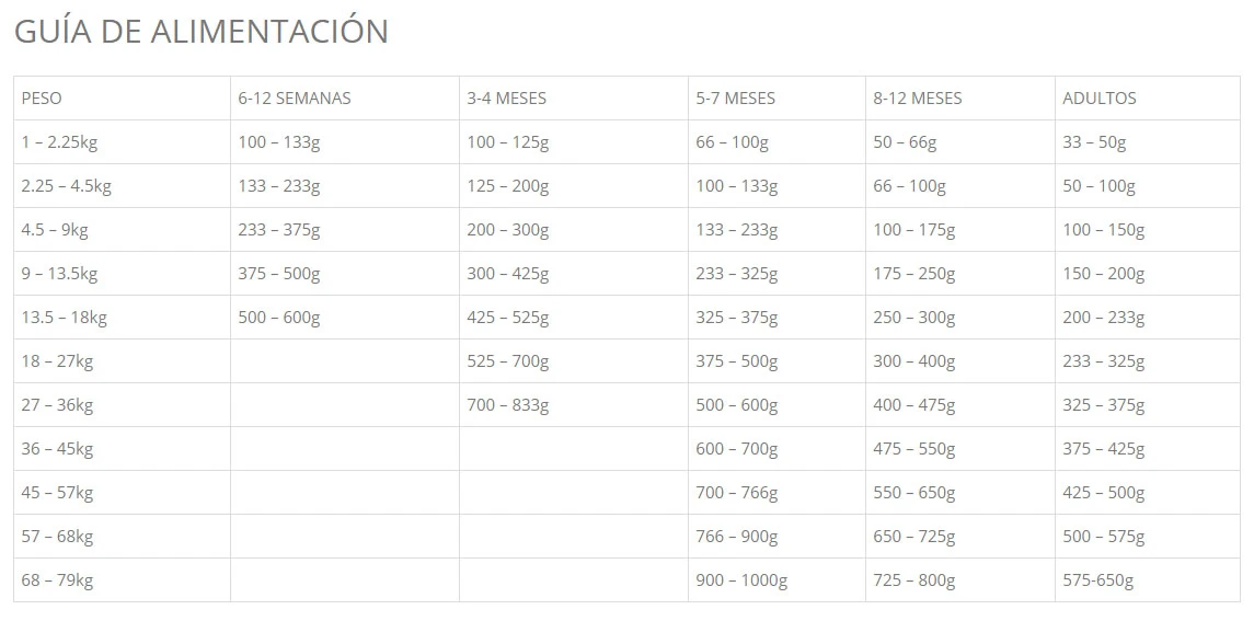 El cambio de alimento debe hacerse de forma gradual durante 7 días. Suministrar la ración diaria en 2 o 3 tomas repartidas durante el día. La cantidad de alimento puede variar en función de la actividad, raza del perro y condiciones ambientales. El perro debe disponer siempre de agua limpia y fresca. Conservar en lugar fresco y seco.