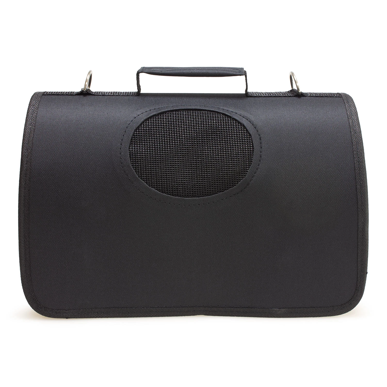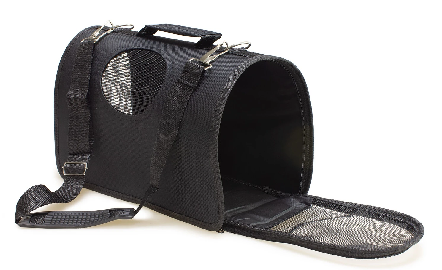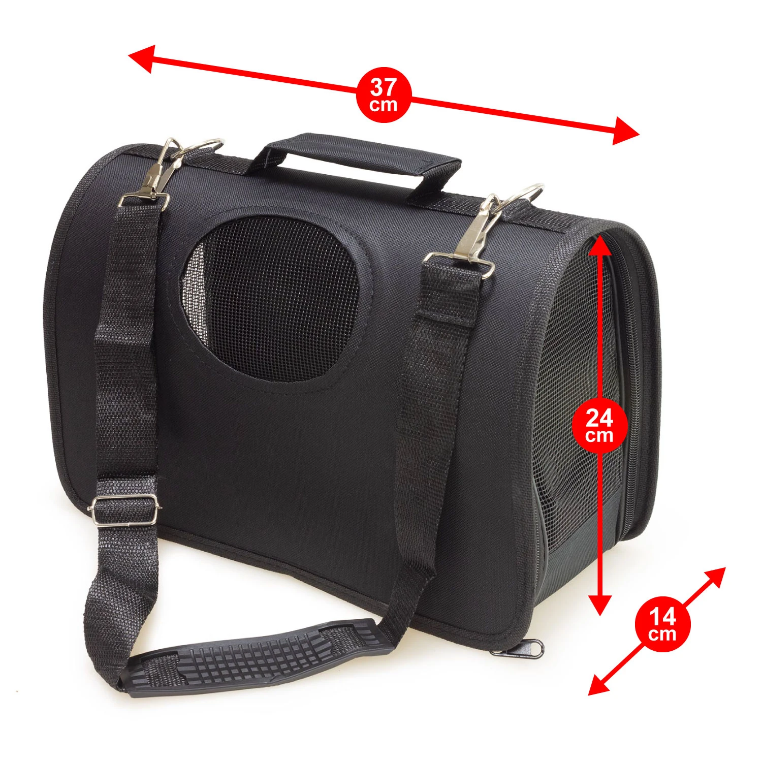 Bolso semi-rígido con manija maletín para el transporte de mascotas y bandolera extraible. Entradas por el extremo mediante cremalleras, mallas de ventilación.