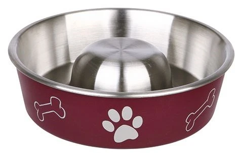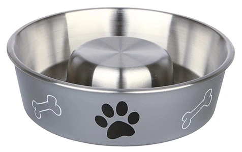 Comedero de acero inoxidable con cubierta de plastico con diseño de huellas y huesos. en su interior tiene formas concavas que evitaran que el perro se alimente de manera muy rapida y asi facilitar su digestión.