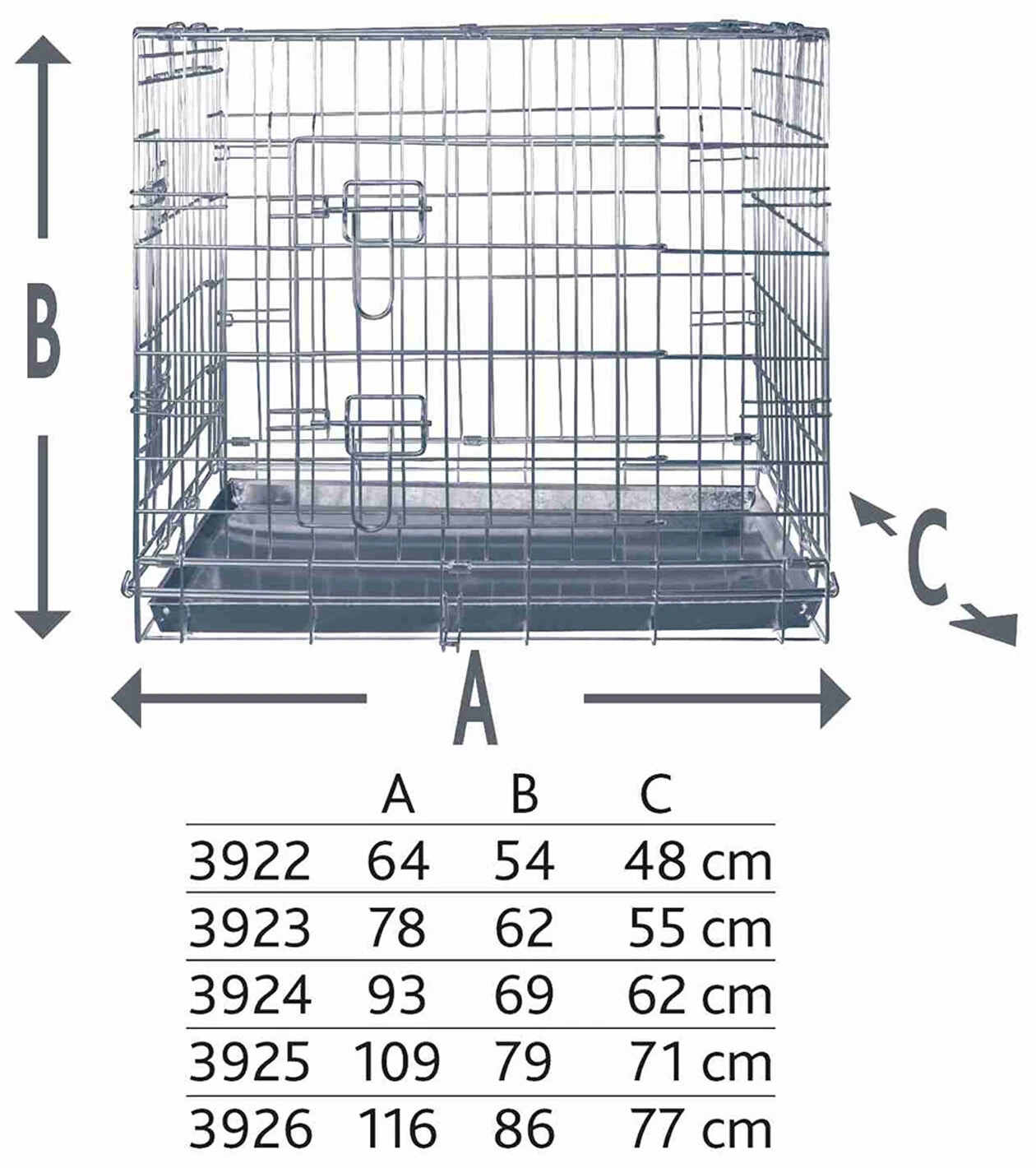Jaula para perros plegable hecha de metal galvanizado de gran calidad. Con base específicamente fabricada para evitar ensuciar el coche en el traslado de la mascota. También es apta para gatos. Disponible en 5 medidas.