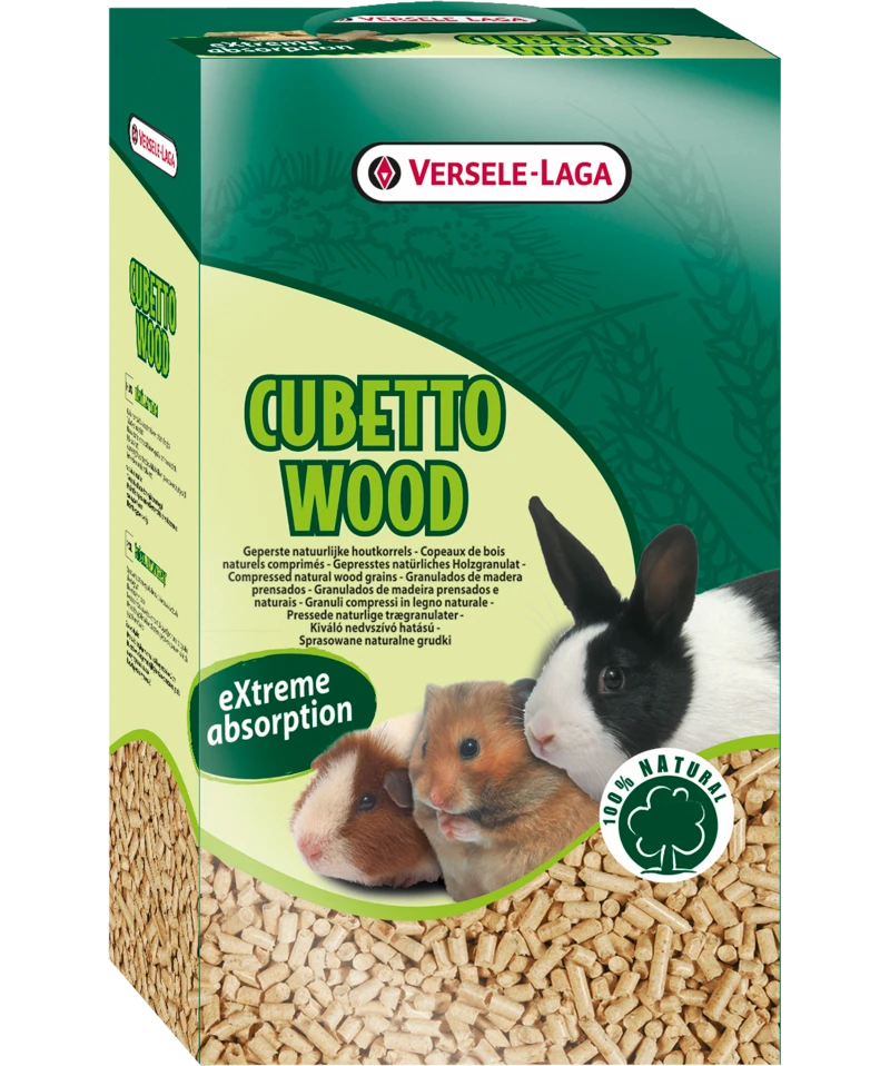 Cubetto Wood es un lecho higiénico de pellets de madera natural comprimidos para jaulas de animales pequeños y terrarios.