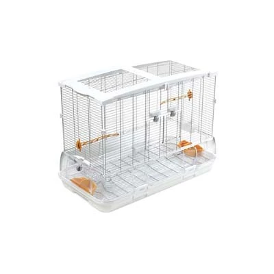 Jaula grande perfecta para pájaros como canarios, periquitos, agapornis y pinzones que quieren mucho espacio para revolotear y jugar. Gracias a su diseño innovador, evita que plumas, comida y demás desperdicios caigan al suelo. Color blanco con accesorios de color naranja. Medidas: 75 x 38 x 54,5 cm. Distancia entre barrotes: 12,33 mm. Grosor de los barrotes: 1,6/2,6 mm. Disponible en diferentes tamaños.