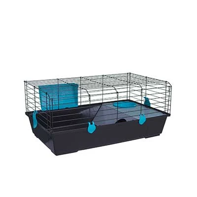 Jaula plegable grande especial para conejos, cobayas y roedores de tamaño similar. Tiene una apertura vertical que permite a tu mascota entrar y salir sin problemas. El color de los accesorios dependerá de la disponibilidad del fabricante (verde, azul o rosa). Jaula en color negro.