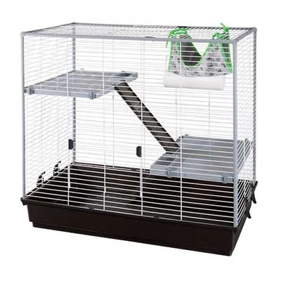 La jaula Voltregá 266 para todo tipo de hurones es amplia y plegable. Es una jaula con gran espacio ya que está formada por dos pisos. Incluye los pisos, la escalera, un tubo y una hamaca. Todos estos accesorios para la jaula son de plástico polipropileno, no tóxico.