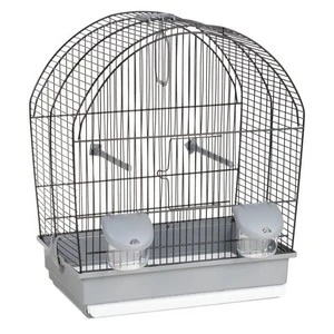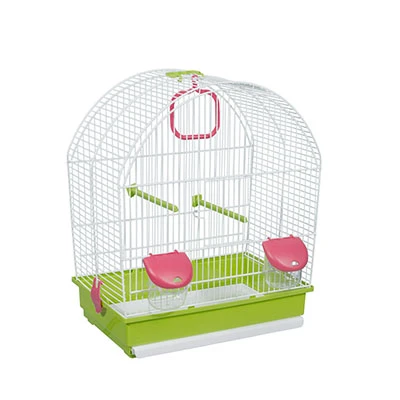 Jaula para aves pequeñas. Incluye asa para llevar o colgar, 2 comederos, columpio, 2 saltadores y bandeja extraíble. Medidas: 41 x 25,5 x 48cm. Disponible en blanco.