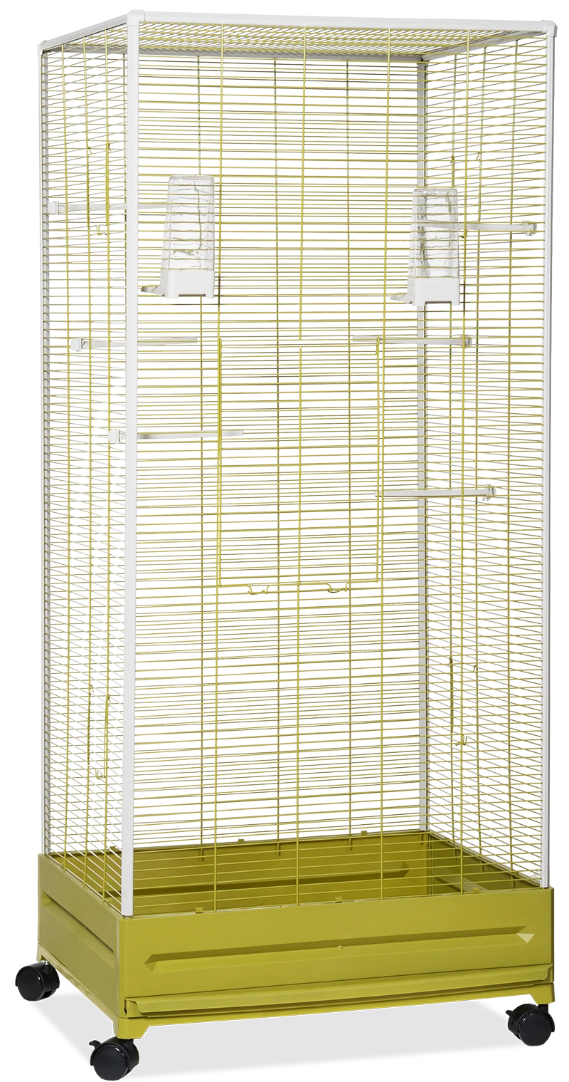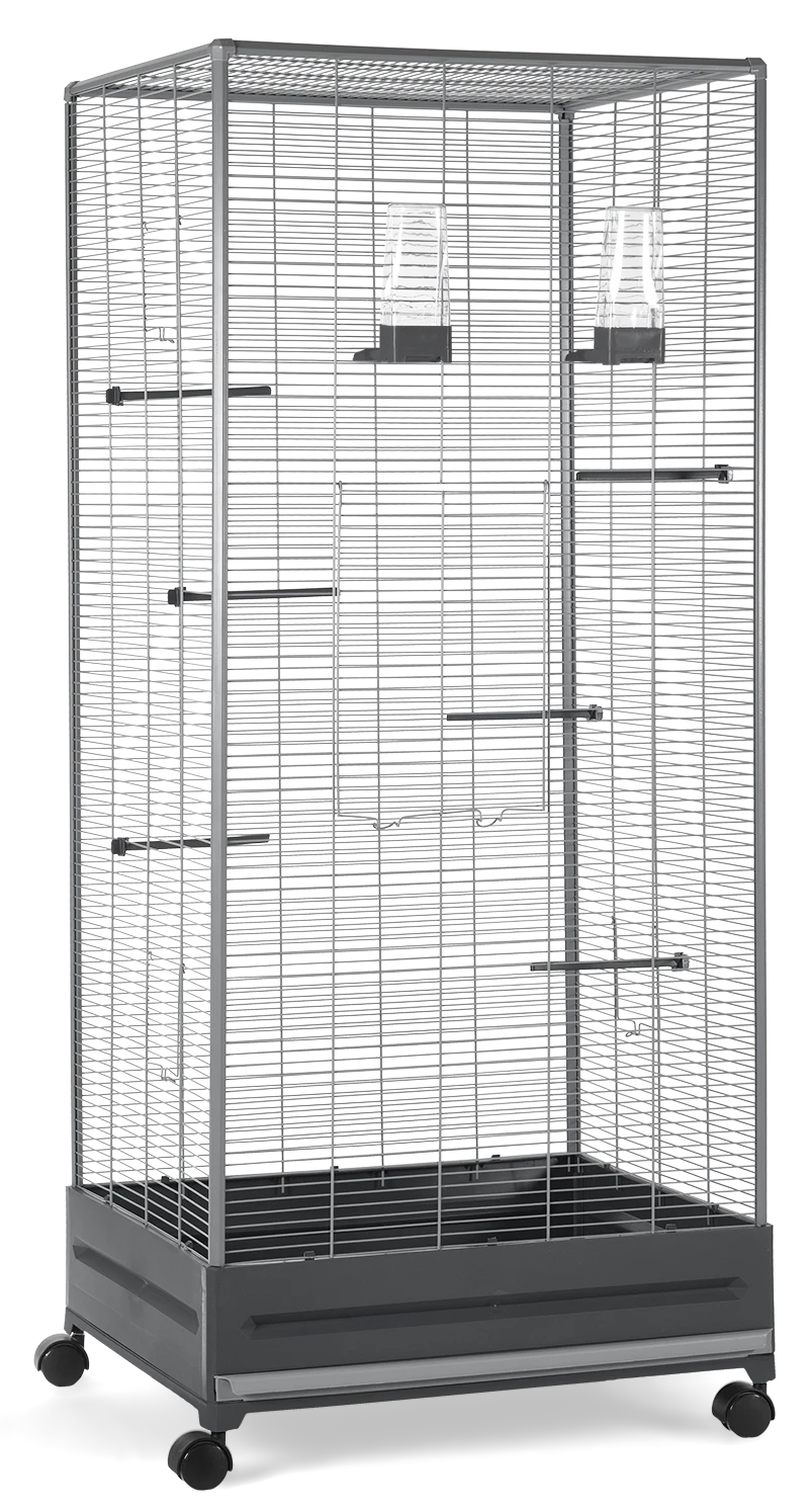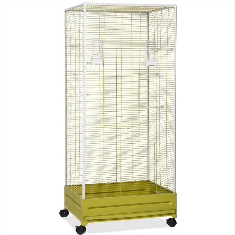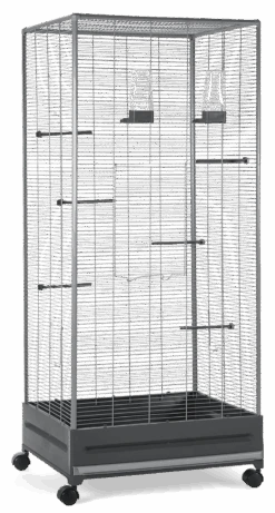 La jaula para pájaros incorpora todo un surtido de accesorios, entre ellos: 4 saltadores, 2 comederos / bebederos, 4 ruedas y 1 bandeja inferior extraible.