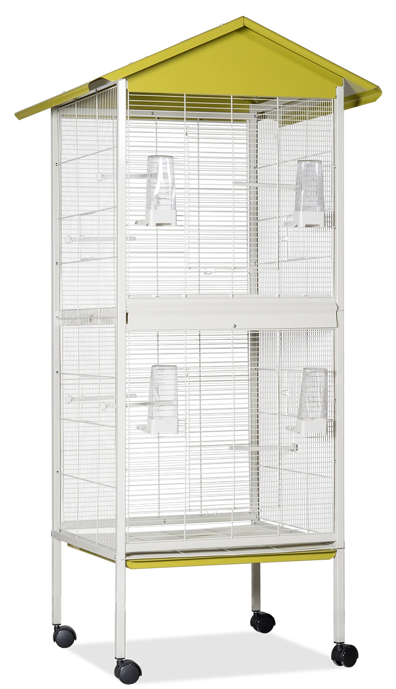 Pajarera de color gris-pistacho con 4 ruedas. Apta para todo tipo de pájaros. Contiene dos comederos-bebederos de gran capacidad especialmente diseñados para la jaula de hilo horizontal. Medidas: 78 x 74 x 165 cm.