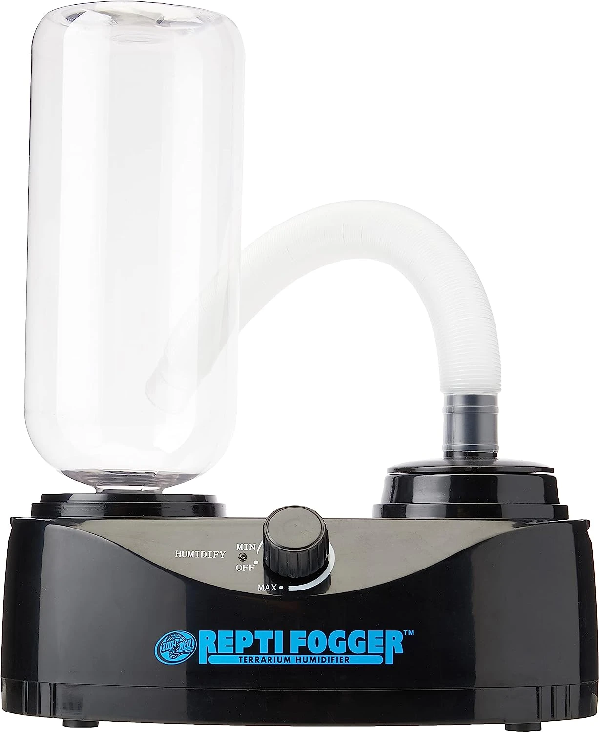 REPTI FOGGER es un nuevo humidificador para terrarios con control ajustable de salida de la neblina. Puede colocarse fuera del terrario con lo que se evitan riesgos y molestias (vibraciones, falta de espacio, cables…) a los habitantes del terrario. Una válvula anti-vertido permite que sea más fácil quitar y rellenar el depósito de agua. Incluye una botella de 1 litro y todos los accesorios necesarios